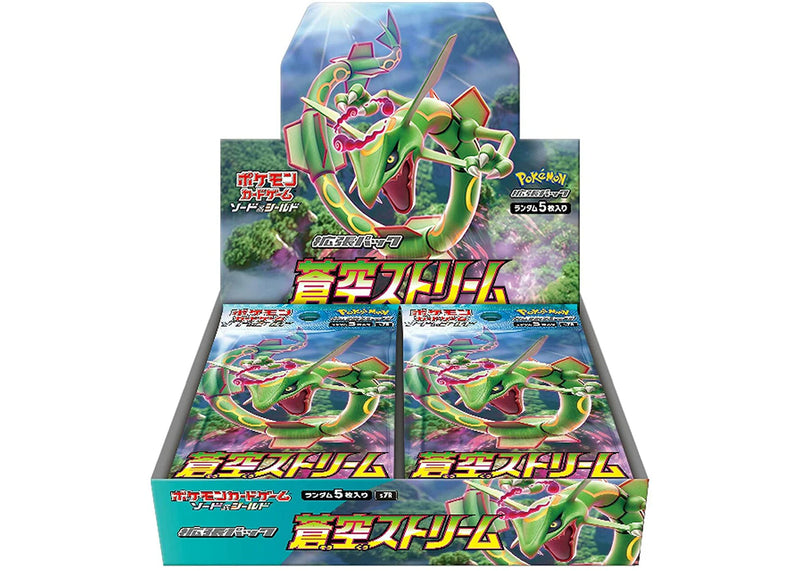 The Pokémon Blue Sky Stream Booster Box is perfect for those hunting for Rayquaza VMAX. The box comes in the typical Japanese Pokémon card booster box format holding 30 Pokémon Blue Sky Stream booster packs that contain five Japanese language Pokémon cards each. The Pokémon Skyscraping Perfection/Blue Sky Stream dual set also brings a new batch of Single Strike and Rapid Strike cards to the game.