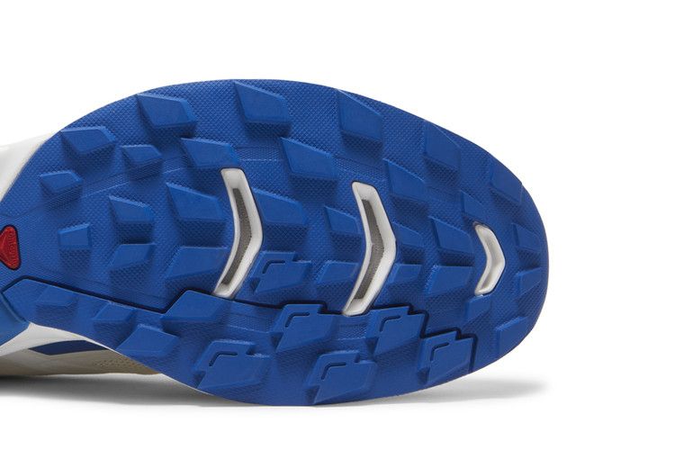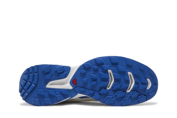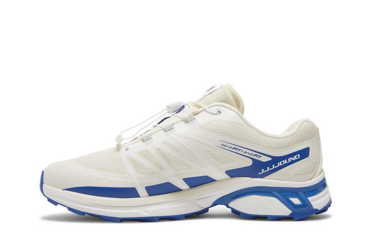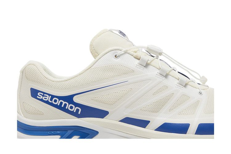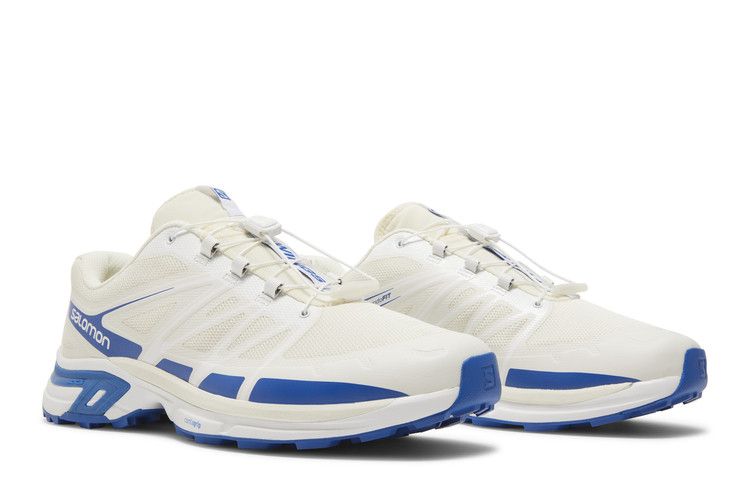 The Salomon XT-Wings 2 JJJJound Lapis Blue features a white mesh and synthetic upper with blue accents for a minimalist look. Designed for trail running, it includes a reinforced toe...