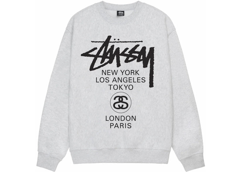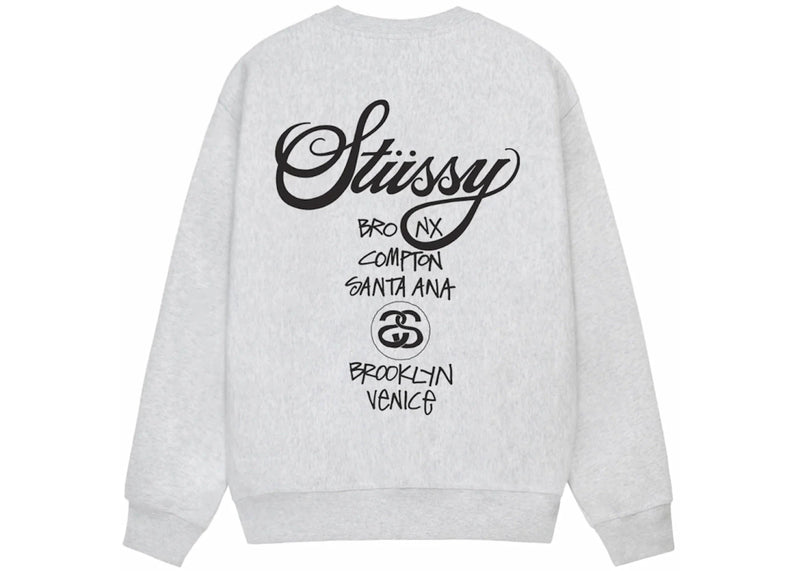 The Stussy World Tour Crewneck Ash Heather is now available at Side Kicks!