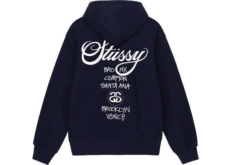 The Stussy World Tour Zip Hoodie Navy (FW22) is now available at Side Kicks!