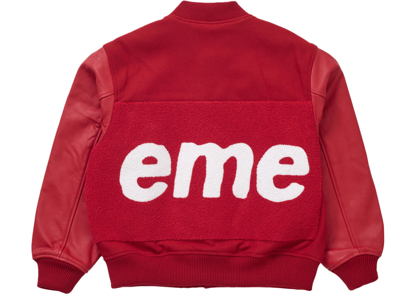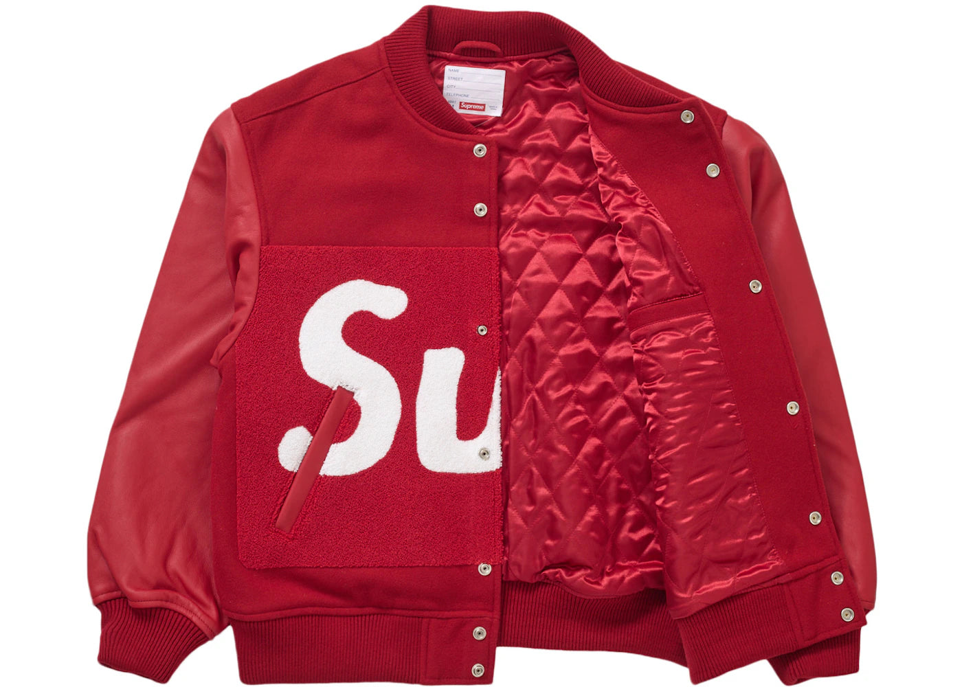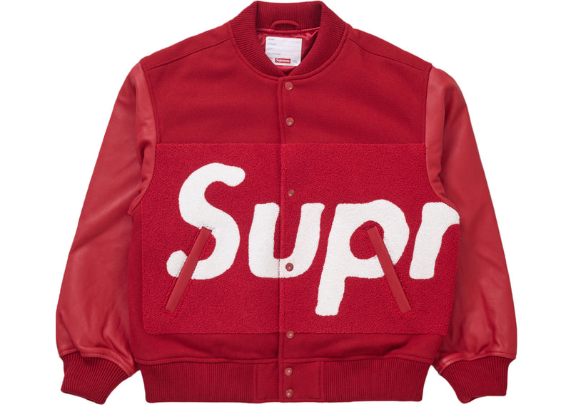 The Supreme Big Logo Chenille Varsity Jacket Red is now available at Side Kicks!