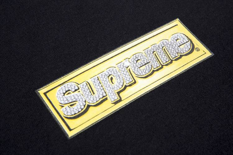 This hooded sweatshirt features Supreme's iconic box logo design embellished with glittering gemstones. Made from durable materials, it includes an adjustable hood for added versatility. Perfect for adding a touch of bling to your streetwear wardrobe.