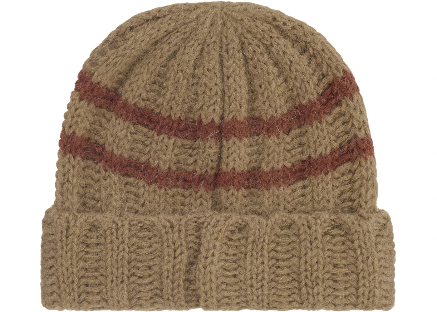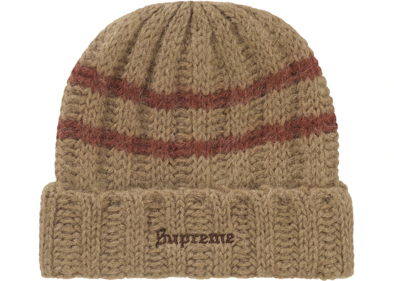 The Supreme Brushed Stripe Beanie Camel is now available at Side Kicks!