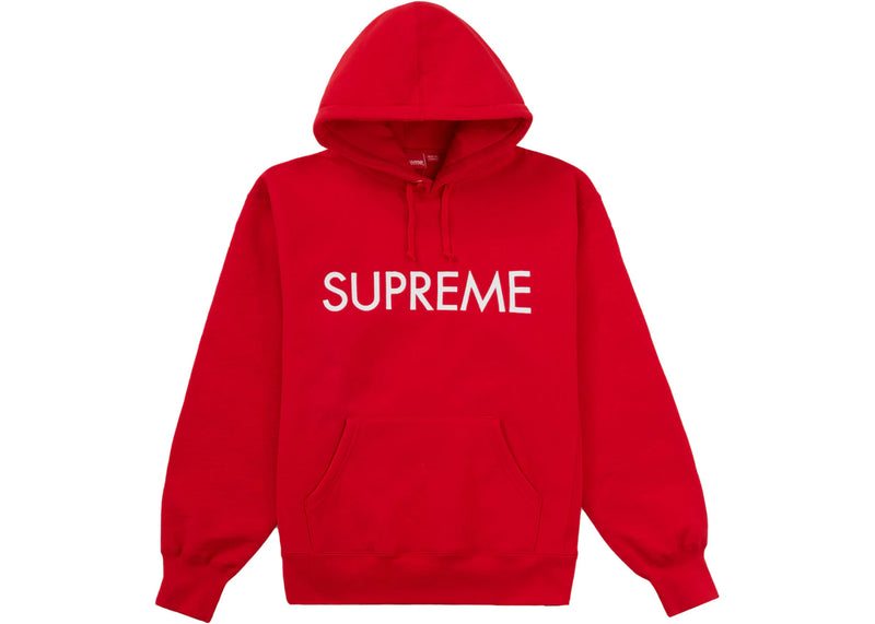 The Supreme Capital Hooded Sweatshirt Red is now available at Side Kicks!