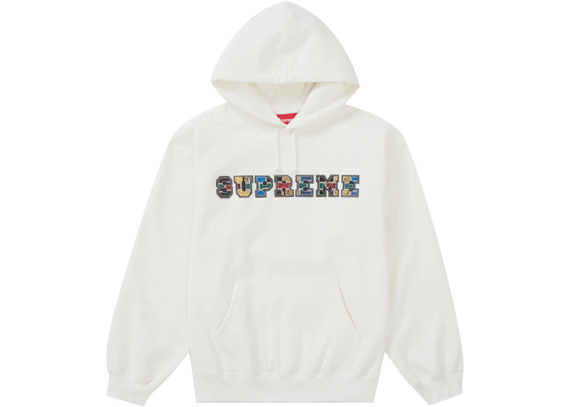 The Supreme Collegiate Patchwork Leather Hooded Sweatshirt White is now available at Side Kicks!