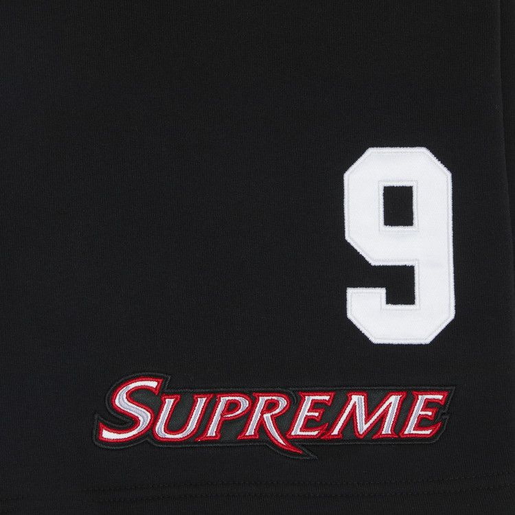 The Supreme Equipé Sweatshort in 'Black' is crafted from brushed-back fleece material, featuring on seam hand pockets and a single back patch pocket. It includes an elastic waistband with an interior drawcord for an adjustable fit. The shorts showcase tackle twill appliqué and an embroidered patch detail on the thighs. Designed to provide both comfort and style, this garment is a versatile addition to any wardrobe.