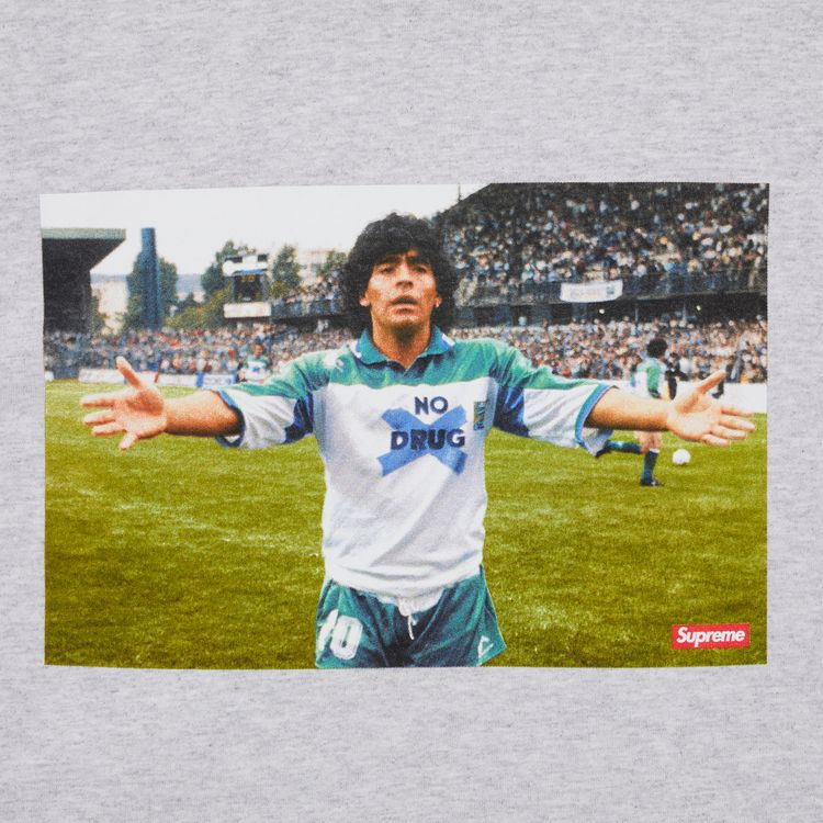 The Supreme Maradona Tee 'Ash Grey' is a 100% cotton t-shirt in light gray heather, showcasing a full-color image of Diego Maradona on the front. The Supreme box logo in red with white text is featured in the lower corner, complemented by Supreme branding on the interior care label. Inspired by iconic figures, this tee pays tribute to Maradona in his "No Drugs" jersey.