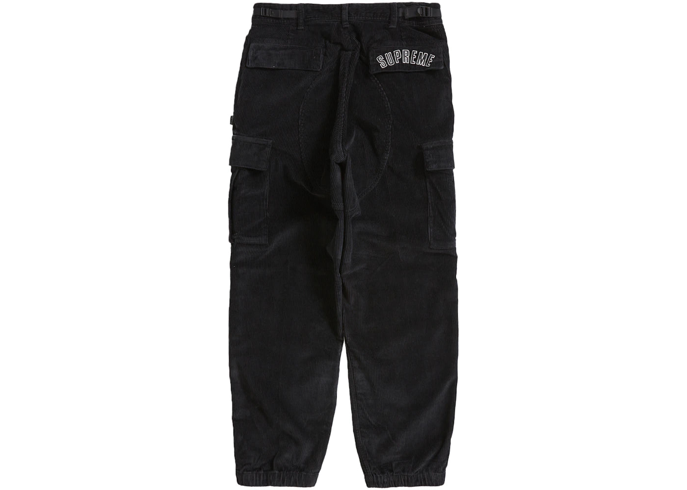 The Supreme Nike Arc Corduroy Cargo Pant Black is crafted from corduroy in a monochrome design. It features a white mini Swoosh on the left pocket and arched "Supreme" branding...