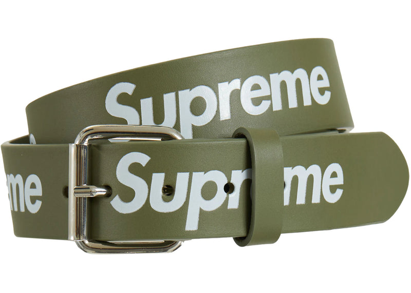 The Supreme Repeat Leather Belt Olive is now available at Side Kicks!