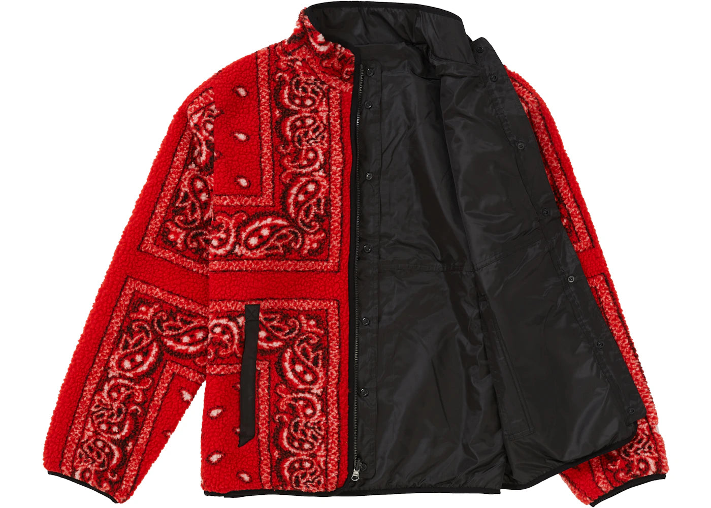 The Supreme Reversible Bandana Fleece Jacket Red is now available at Side Kicks!