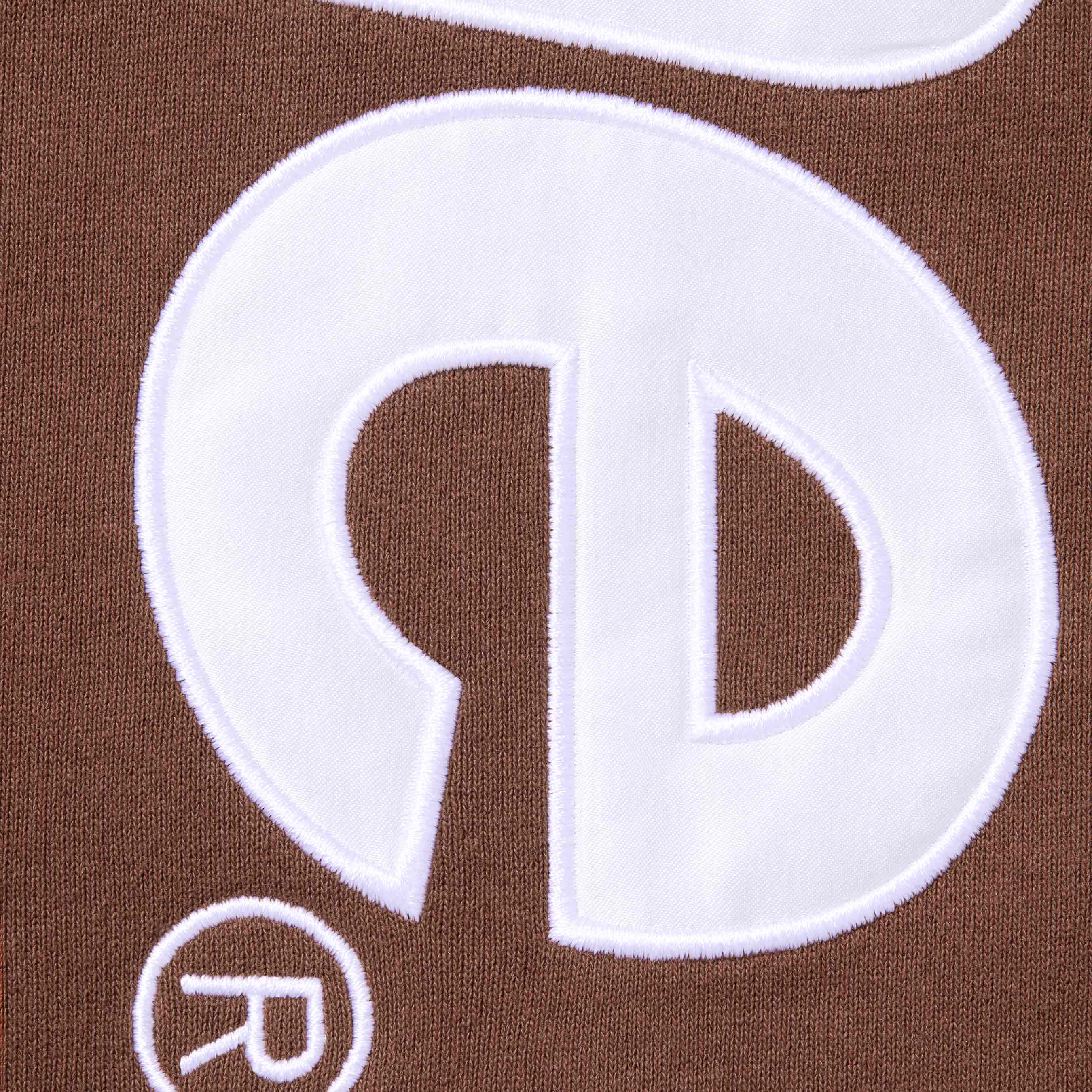 The Supreme Satin Appliqué Hooded Sweatshirt - Brown is now available at Side Kicks!