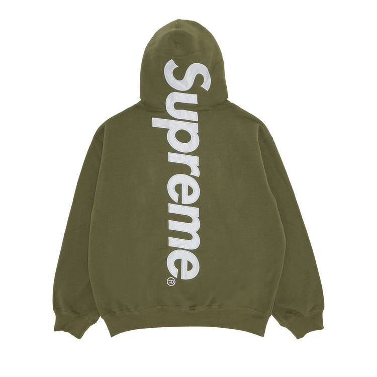 The Supreme Satin Appliqué Hooded Sweatshirt 'Light Olive' is now available at Side Kicks!