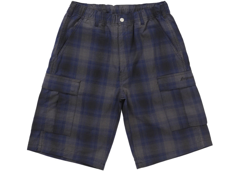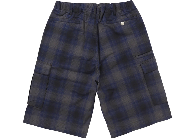 The Supreme Shadow Plaid Cargo Short Navy is now available at Side Kicks!