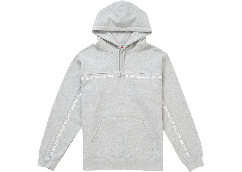 The Supreme Text Stripe Hooded Sweatshirt Heather Grey is now available at Side Kicks!