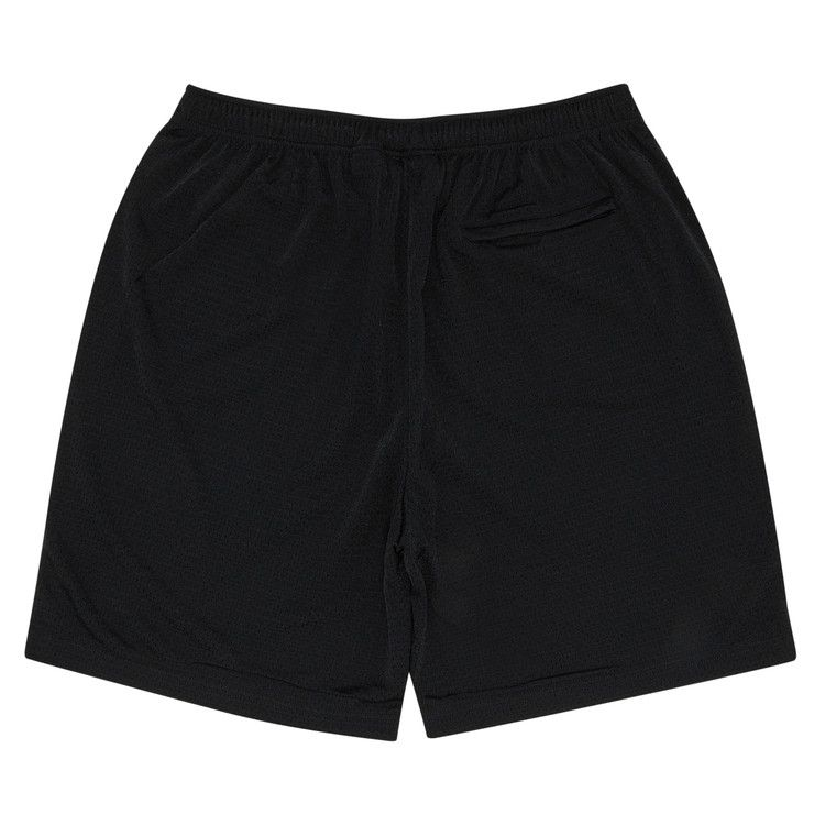 The Supreme Ultrasuede Mesh Short 'Black' is crafted from ultrasuede mesh with a poly mesh lining. It features on-seam hand pockets, a single back zip pocket, and a knit rib waistband with an interior drawcord. The shorts also sport a tackle twill logo appliqué at the side.