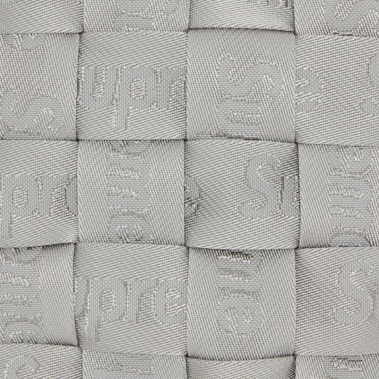 The Supreme Woven Shoulder Bag in 'Grey' features a light grey jacquard woven logo webbing with a two-way zip fastening on the main compartment. The bag includes an adjustable shoulder strap and a distinctive interwoven design with a jacquard logo motif. This 2L capacity bag is versatile and suitable for daily use.