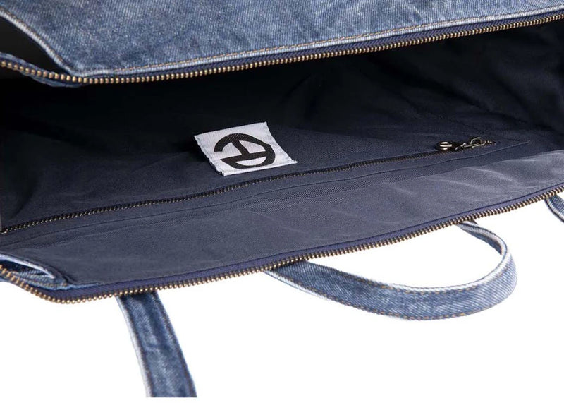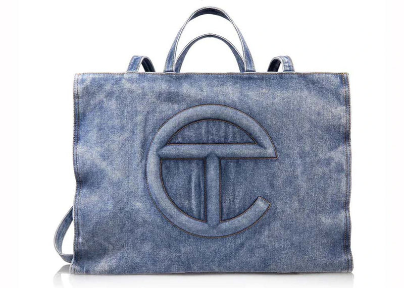 The Telfar Large Denim Shopping Bag Blue is now available at Side Kicks!