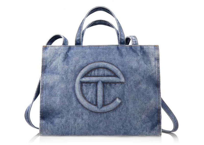 The Telfar Medium Denim Shopping Bag Blue is now available at Side Kicks!