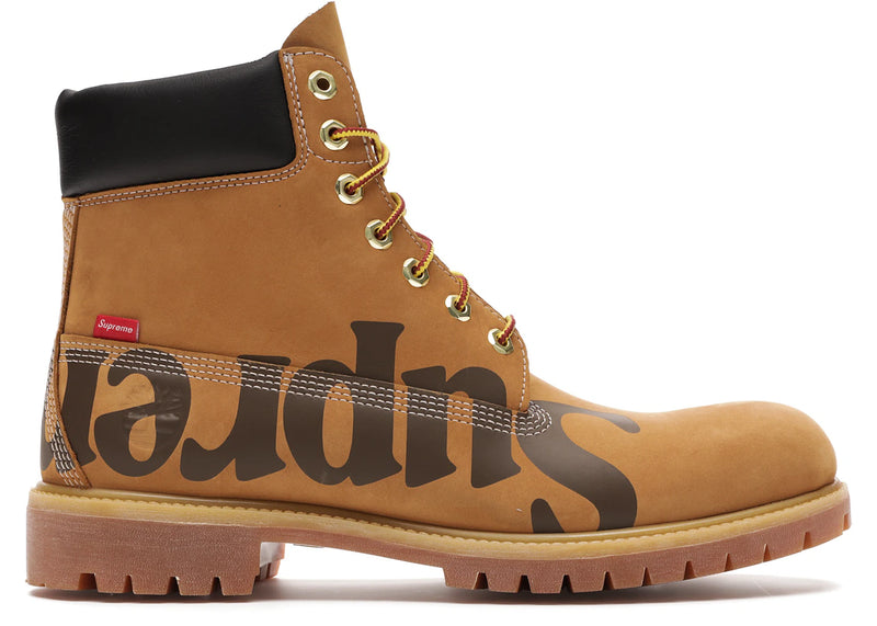 The Timberland 6" Supreme Wheat has a Wheat nubuck and leather upper, with brown nubuck as the primary material. It includes an oversized tree logo, Supreme box logo, and large brand lettering.