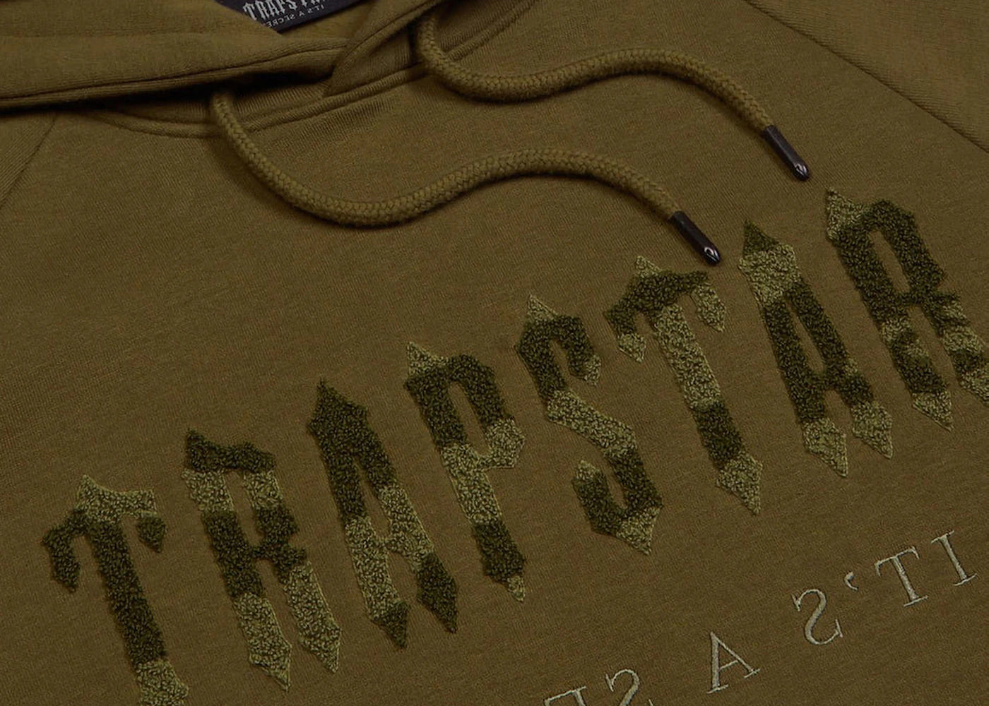 The Trapstar Chenille Decoded Hooded Tracksuit Olive Camo is now available at Side Kicks!