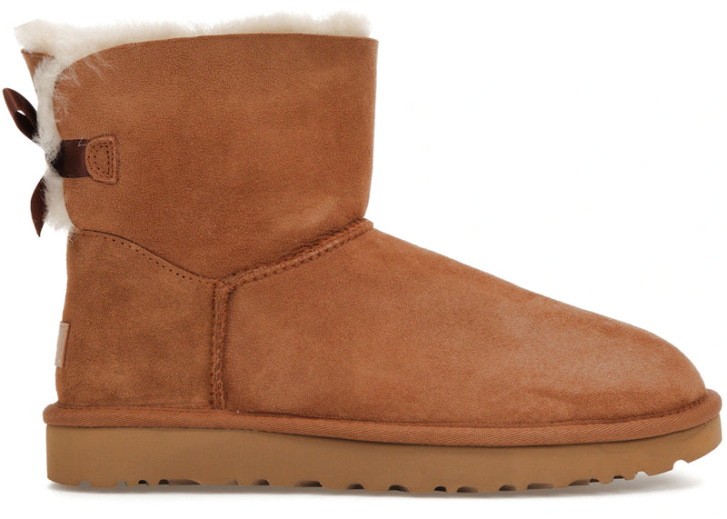 The UGG Mini Bailey Bow II Chestnut (Women's) features a sheepskin upper in a warm chestnut hue, reinforced with polyester binding. The lining and insole consist of soft sheepskin, while a satin bow secures the front. This shorter boot has a 6-inch shaft and a durable Treadlite or sugarcane-based outsole. A heat-embossed UGG logo adorns the heel, and the exterior is treated for water resistance.