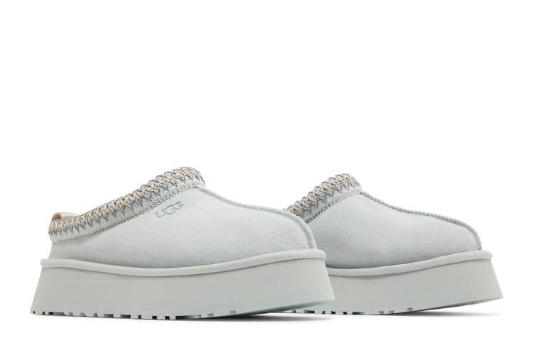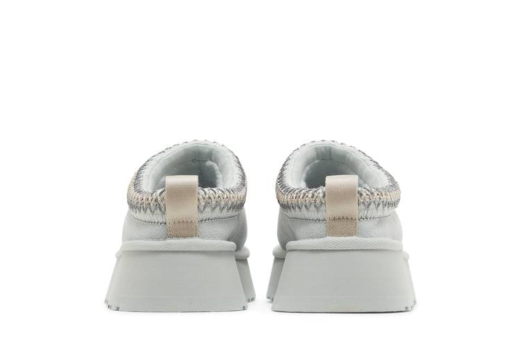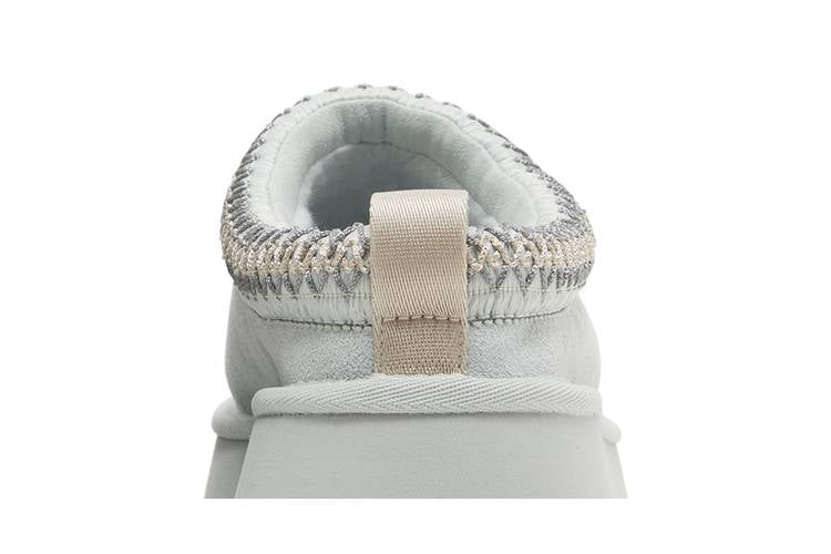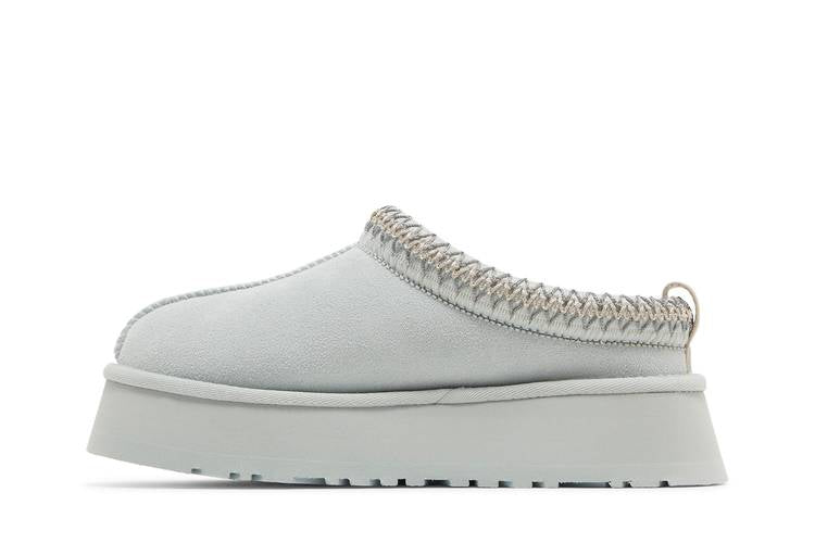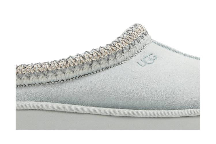 The UGG Tazz Slipper Goose (Women's) features a Goose-colored suede upper with a cozy inner lining made of recycled polyester and wool. Drawing inspiration from the UGG Tasman, this slipper has a 1.75-inch platform for added comfort. Details include the UGGbraid collar, heat-embossed 'UGG' logo, and a convenient pull tab on the heel. The addition of beige thread in the UGGbraid complements the overall design.