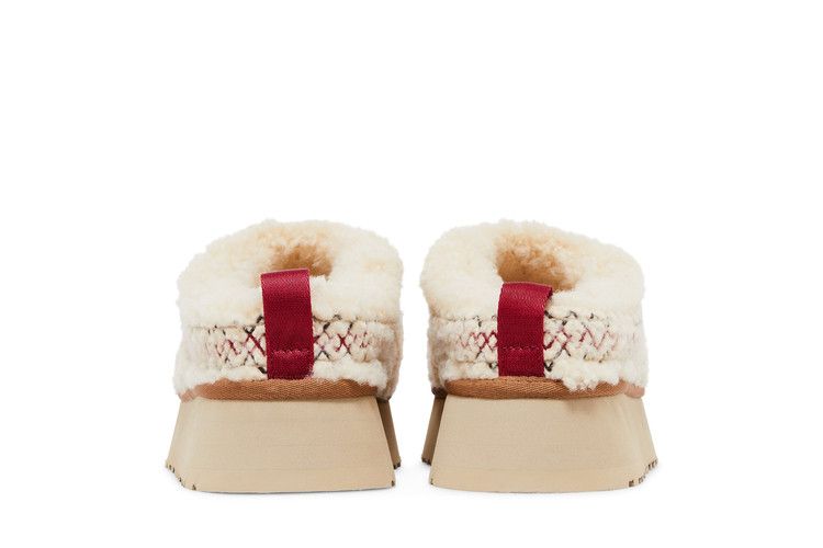 The UGG Tazz Slipper Heritage Braid Natural (Women's) features a soft, curly sheepskin upper in a neutral hue, replacing the traditional suede. Red and black stitching creates a Tasman braid...