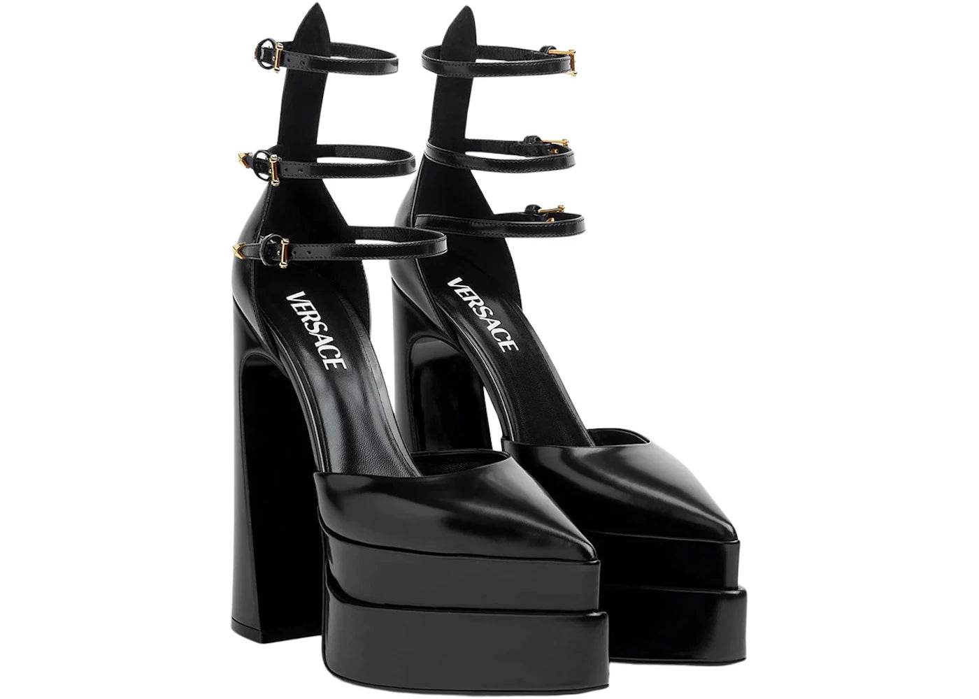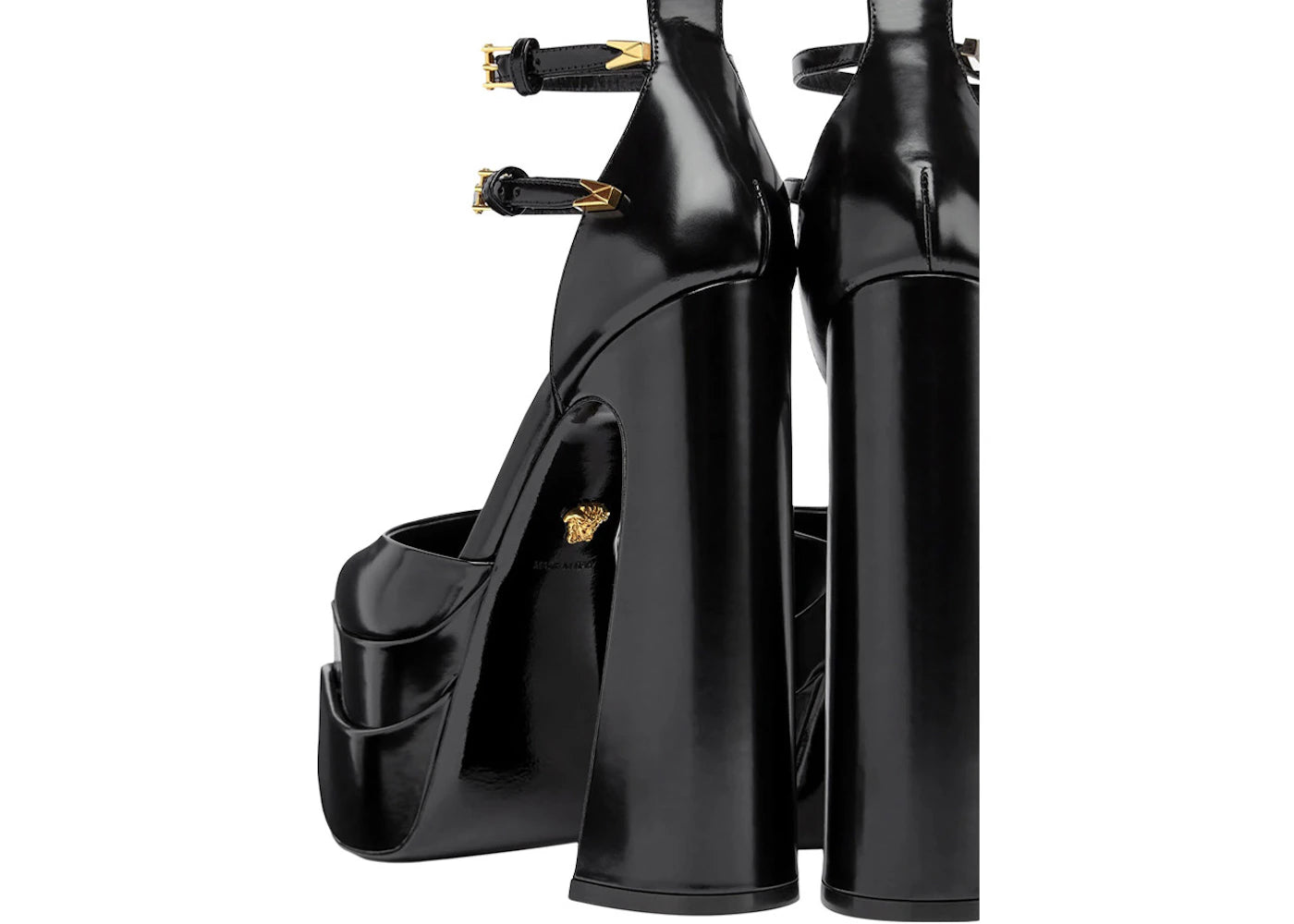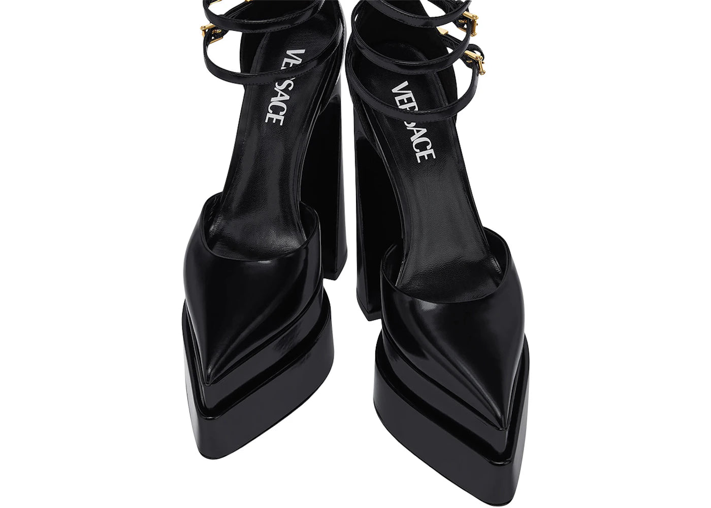 The Versace Aevitas 160mm Pointy Platform Pumps Black Patent Leather is now available at Side Kicks!