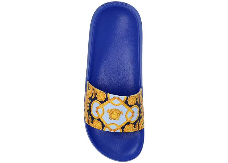 The Versace Baroque Pool Slide Blue Gold is now available at Side Kicks!