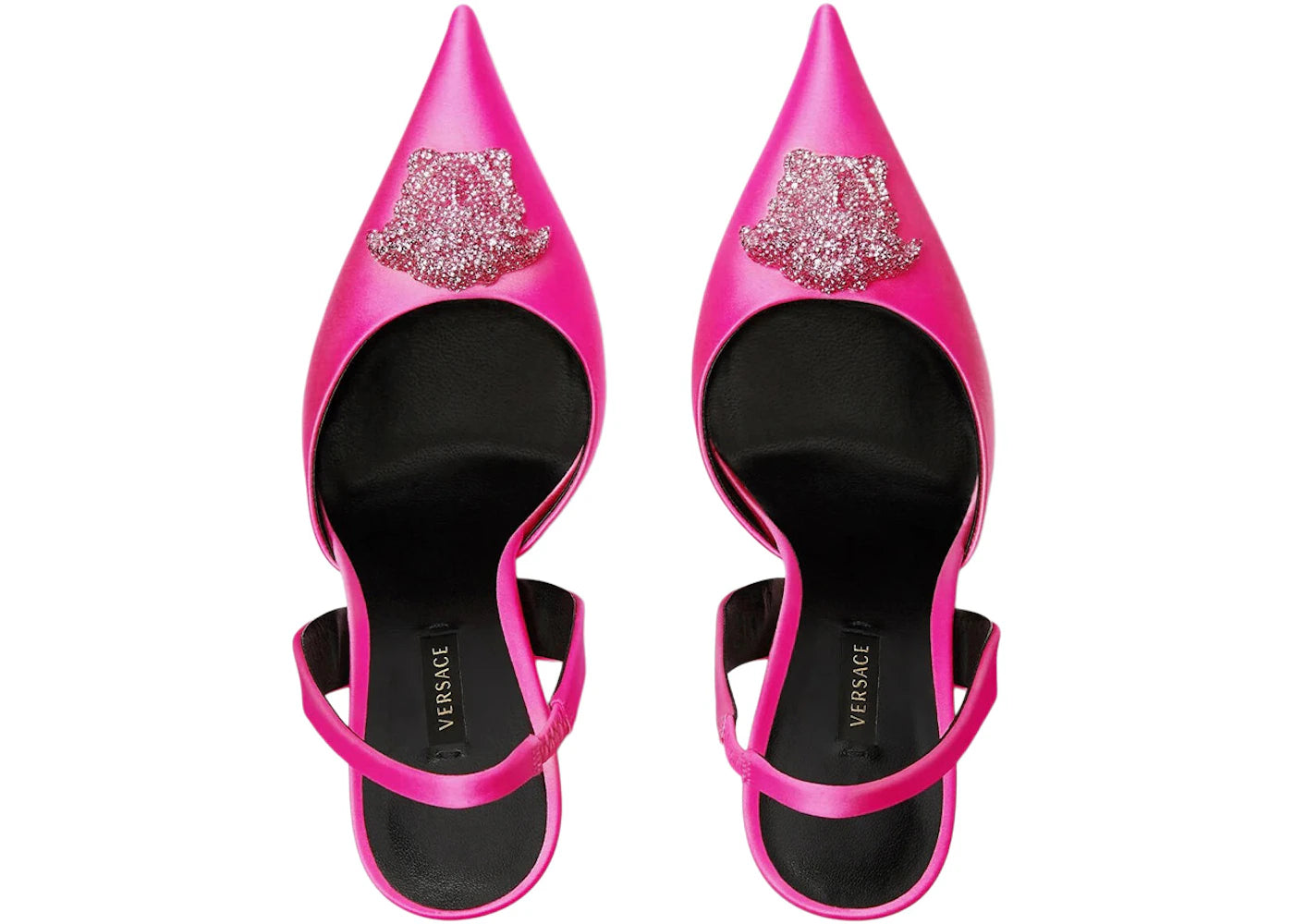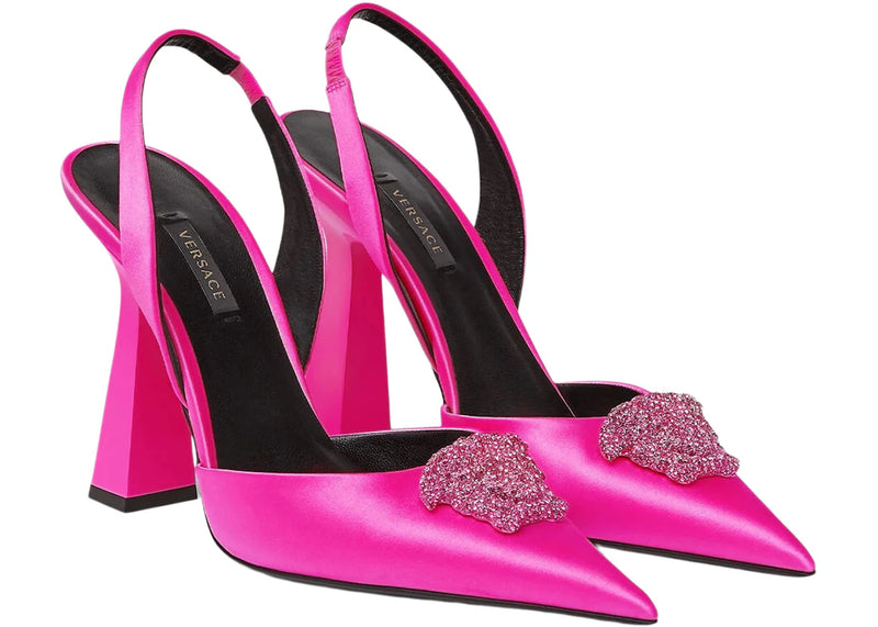 The Versace Crystal La Medusa 110mm Slingback Pumps Fuchsia Satin is now available at Side Kicks!