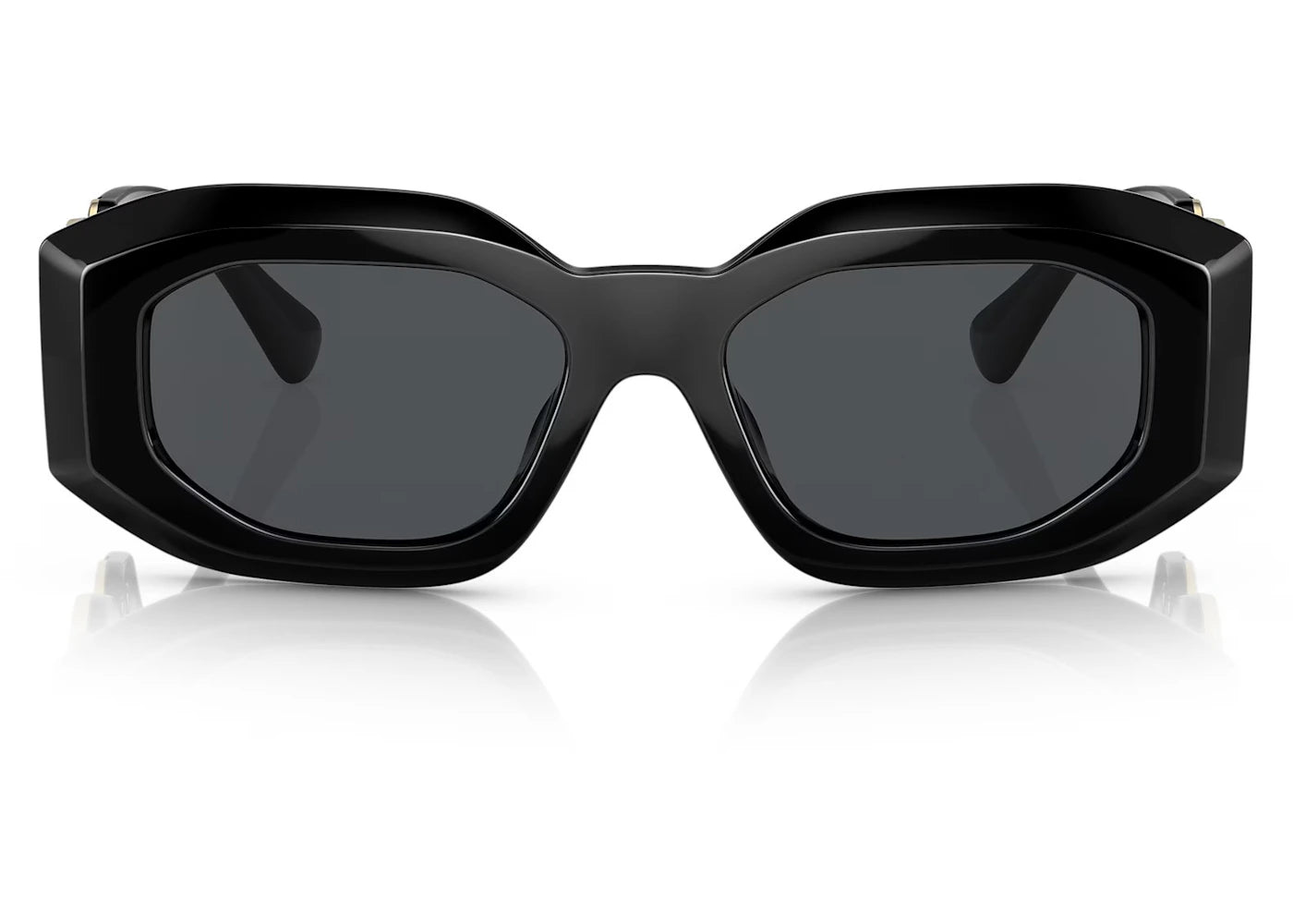 The Versace Irregular Sunglasses Black Dark Grey feature an irregular-shaped frame made from lightweight, durable acetate. The black frame and dark grey lenses provide UV protection while reducing glare. Gold Medusa logos accent the temples for a signature Versace touch. Released on {date}, the Versace Irregular Sunglasses Black Dark Grey are available now at Side Kicks.