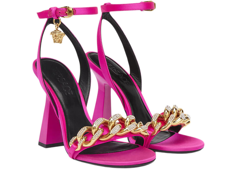 The Versace Medusa 110mm Chain High Heeled Sandals Deep Fuchsia Satin is now available at Side Kicks!