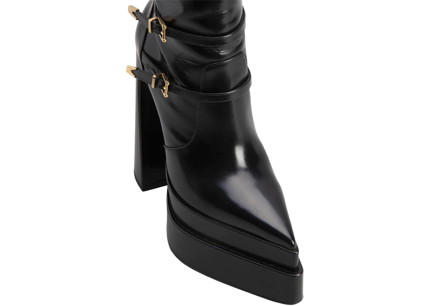 The Versace Medusa Aevitas 165mm Pointy Platform Booties Black Patent Leather is now available at Side Kicks!